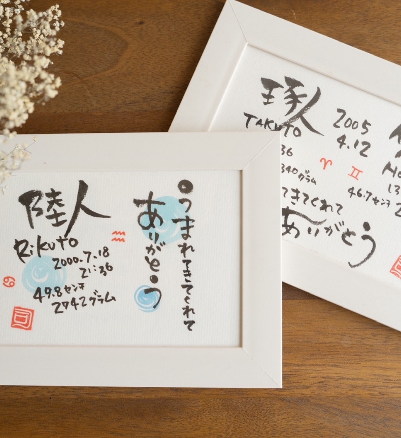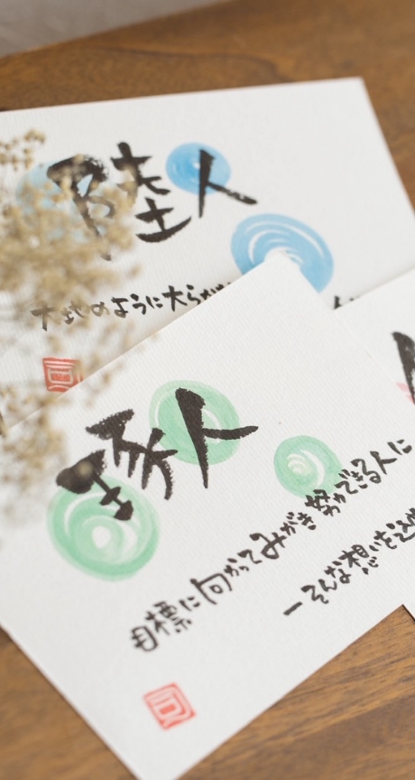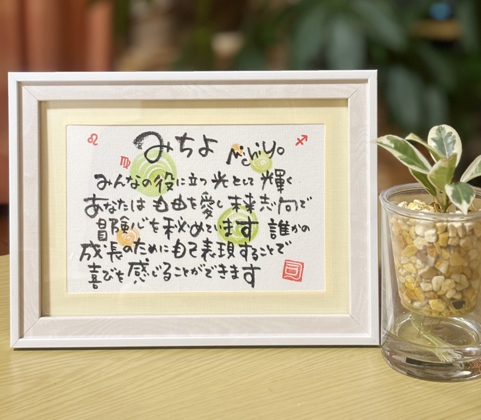 その経験から筆文字に出会い、「文字を通して何かを伝えたい」という思いが強くなり、趣味で学んでいた星読みやタロットからのメッセージを筆文字で表現しはじめました。ありがたいことに「文字に癒される」とのお声をいただき、命名書や開運メッセージなども喜んでいただいています。
